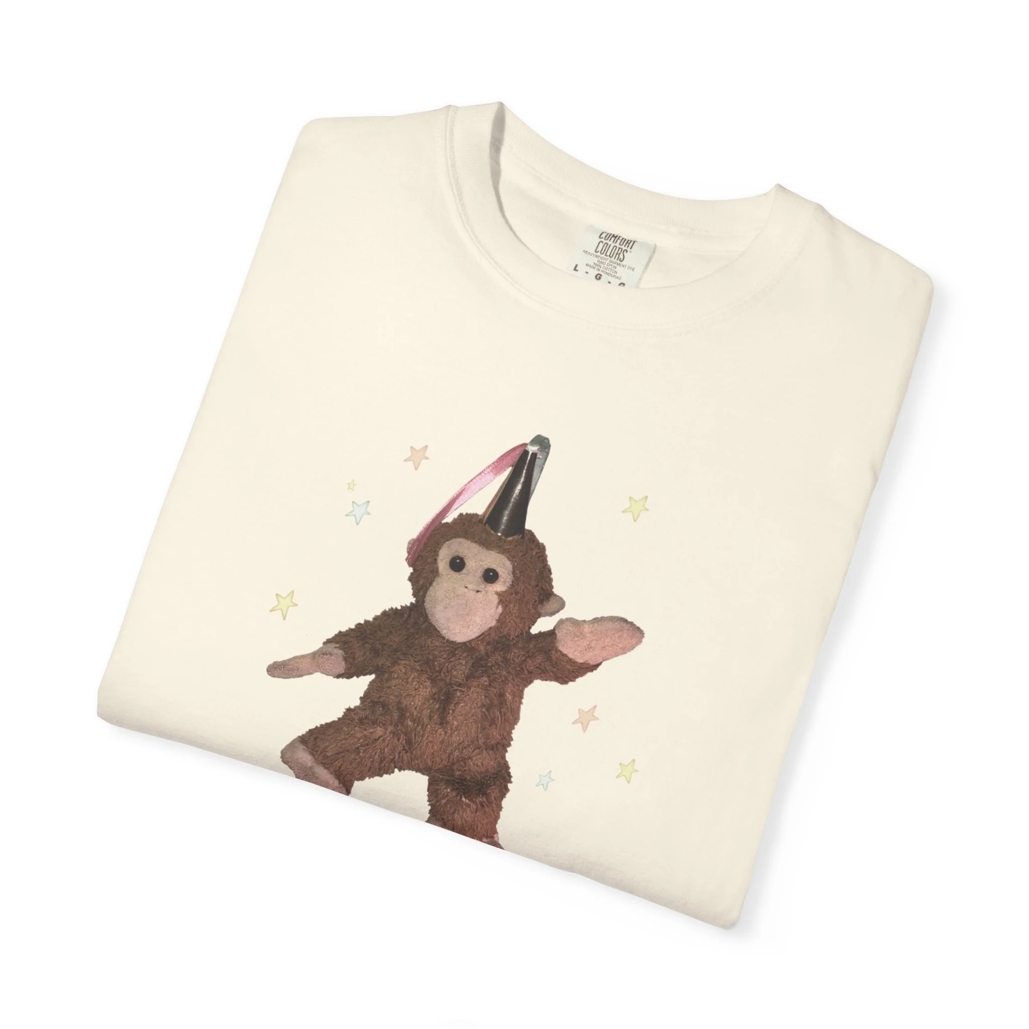 This whimsical tee features Monkey surrounded by pastel stars. Made from 100% ring-spun cotton with a garment-dyed, soft-washed finish, it offers a cozy, lived-in feel from day one. Relaxed fit and double-needle stitching make it a durable, easy favorite.
